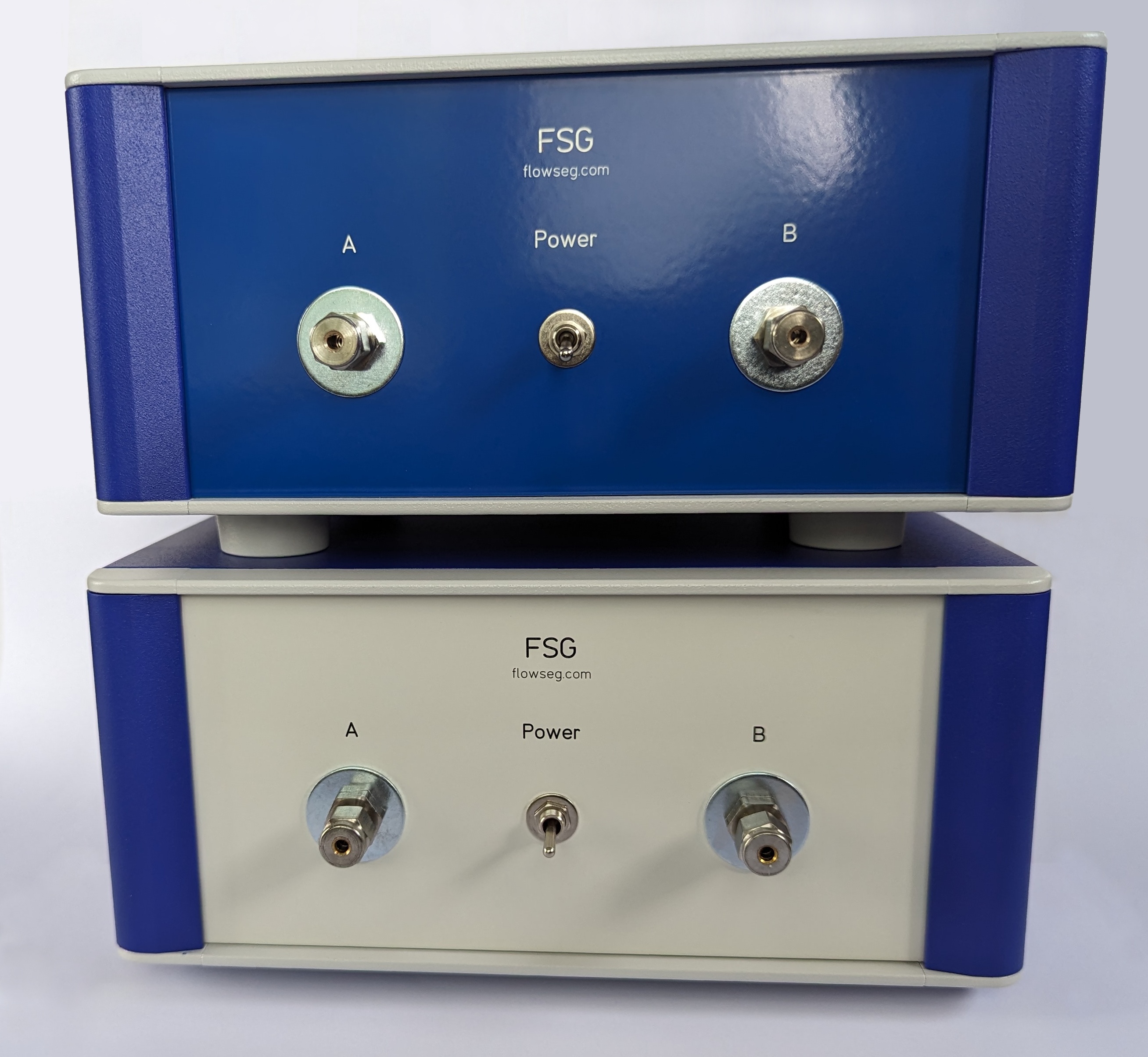 2Mix device controls the flow of gases. The 2Mix is by default made with two gas lines (designated A and B), with individual inputs and outputs. Each line can separately control a flow of a desired gas, and the outputs can be joined together to form a mixture. The device can therefore act just as easy and convenient way to control large number of individual gas and fluid lines separately or use them to form gas mixtures of selected inputs. The flow range of each gas line is freely selectable so that the minimum flow is 1/10 000 of the maximum flow, where the boudaries are 0.000 05 ml/min to 10000 liters/min. The selected range affects the device size, weight, and and price, where these go up steeply for devices with flows larger than 10 liters per minute. The default device is suitable for any non-corrosive gas or gas mixture, with an option for corrosive gases and gas mixtures.